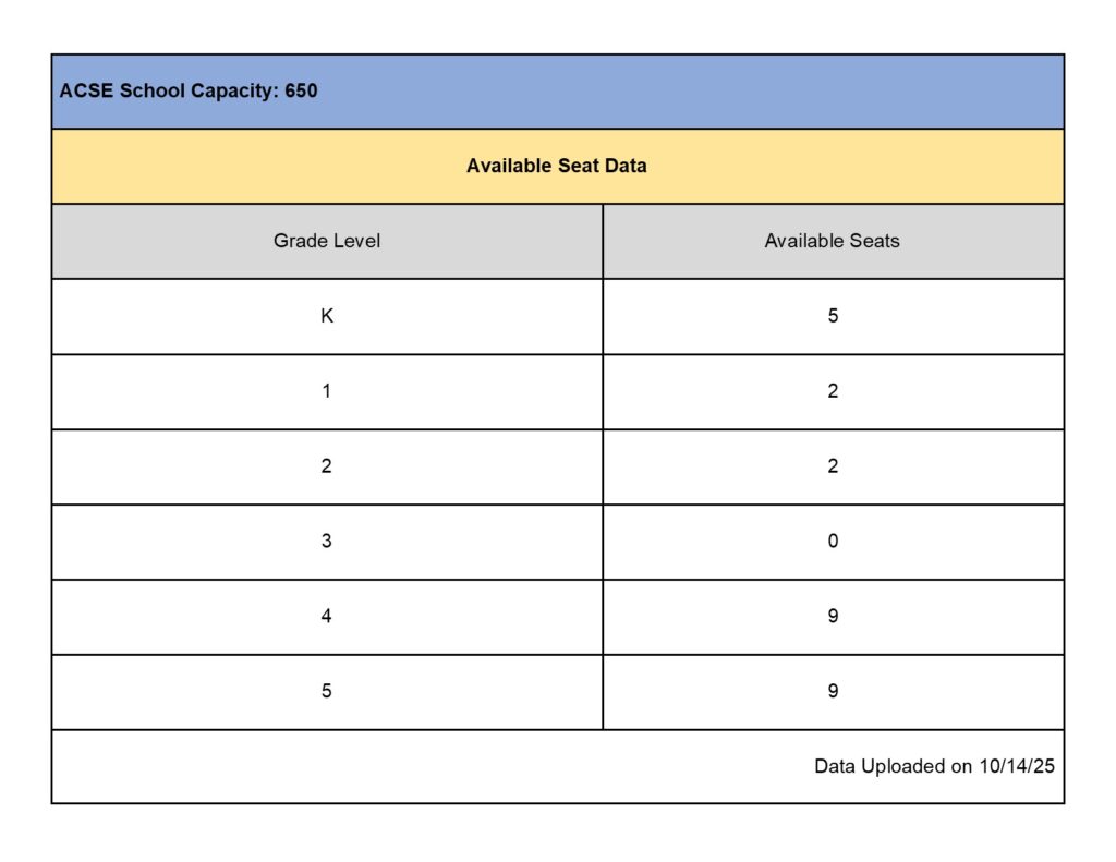 Below is our student capacity/seat availability, by grade level. We are required to update this information every 12 weeks, please note that the capacity number may change during the 12-week period as family members may withdraw or new families apply.